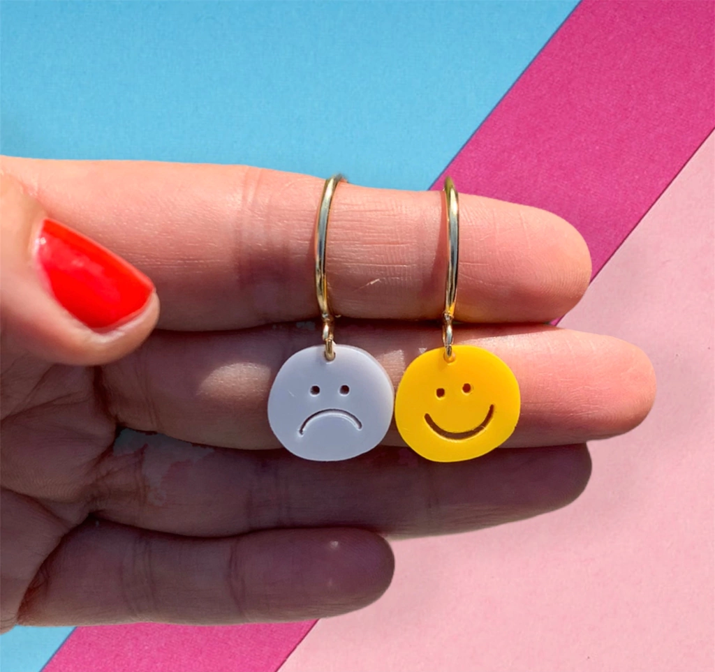 Materiales: acrílico calado / metal bañado en oro (dorado), níquel (plateado).